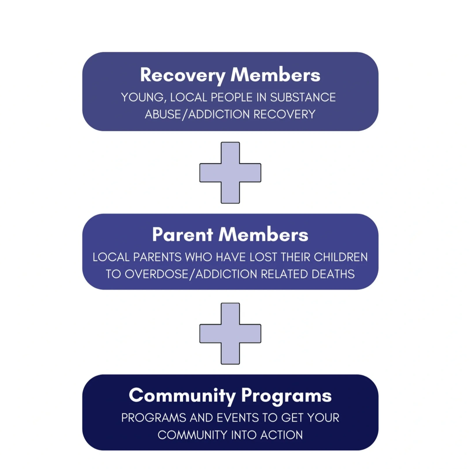 Our Recovery Members are abstinent from all mind-altering drugs, including alcohol. They are responsible local young adults living in the community, building their lives, and actively living a life of recovery. They volunteer their time to speak openly about their feelings and issues during developmental preteen and teen years. The share about their struggles with addiction and how they overcame them. They also speak about the importance of asking for help and opting for better choices.
